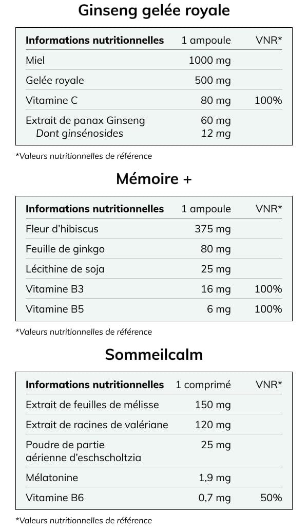 Les ampoules Mémoire+, Ginseng gelée royale et les gélules Sommeilcalm peuvent être prises en simultané pour une action complète.
