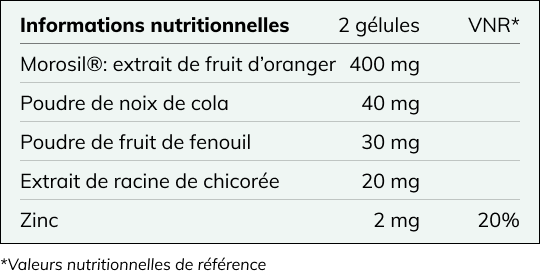 MorosilTM : extrait de fruit d'oranger (Citrus sinensis) ; hydroxypropylmethylcellulose (enveloppe de la gélule d'origines végétales) ; poudre de noix de cola (Cola nitida) ; antiagglomérant : sels de magnésium d’acides gras ; poudre de fruit de fenouil (Foeniculum vulgare) (gluten) ; poudre de racine de chicorée (Cichorium intybus) ; citrate de zinc. MorosilTM est une marque déposée de Bionap S.r.l.